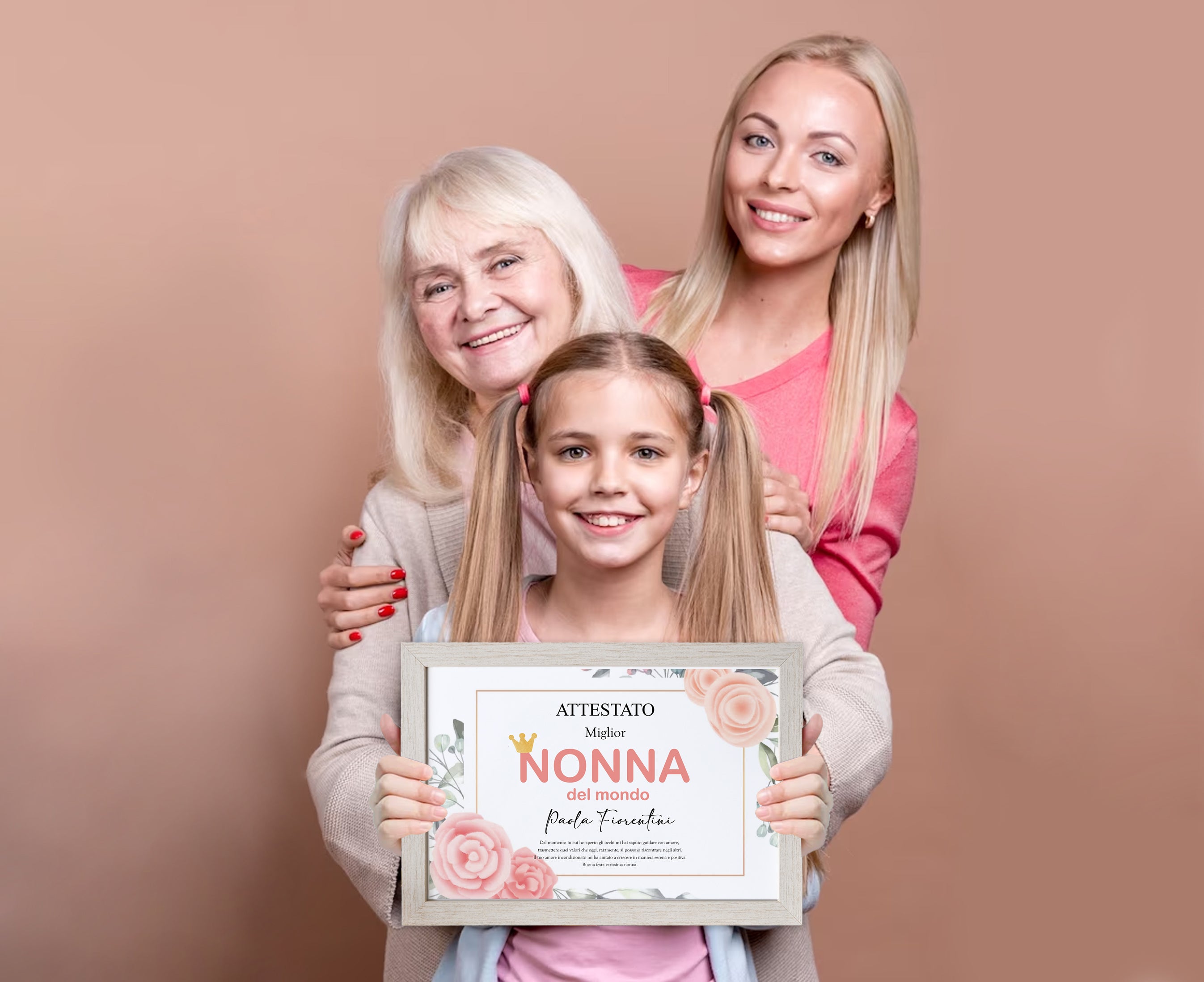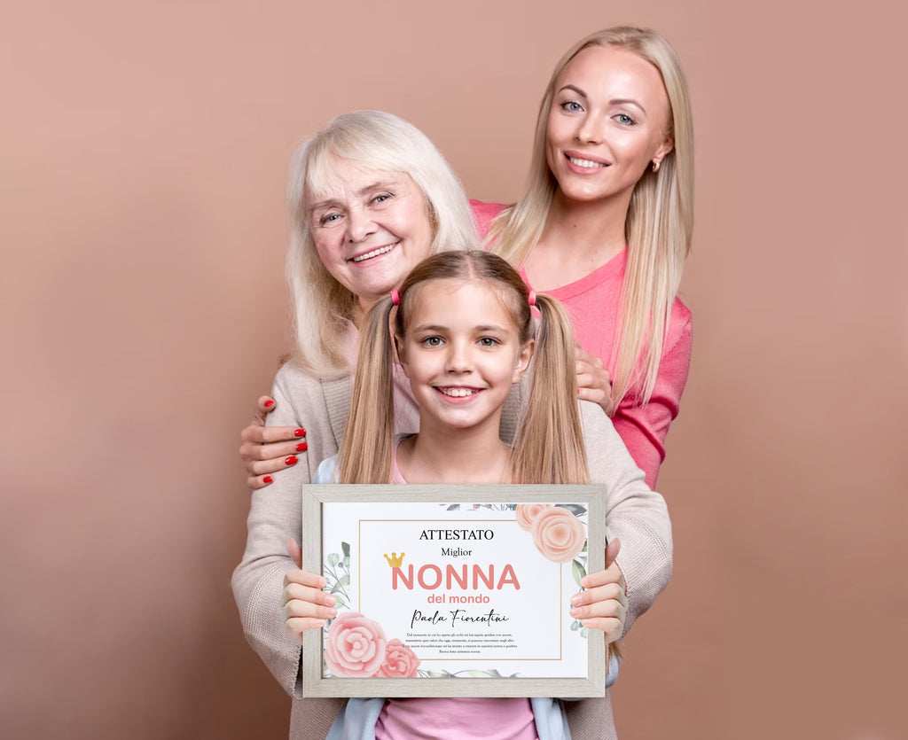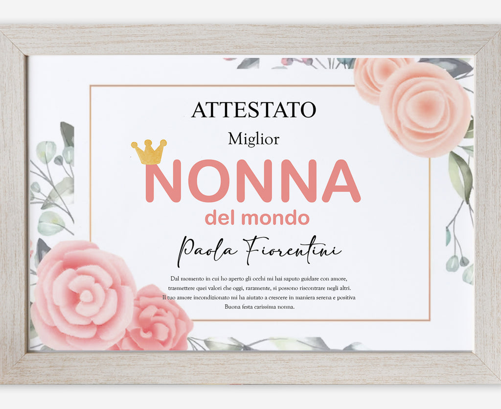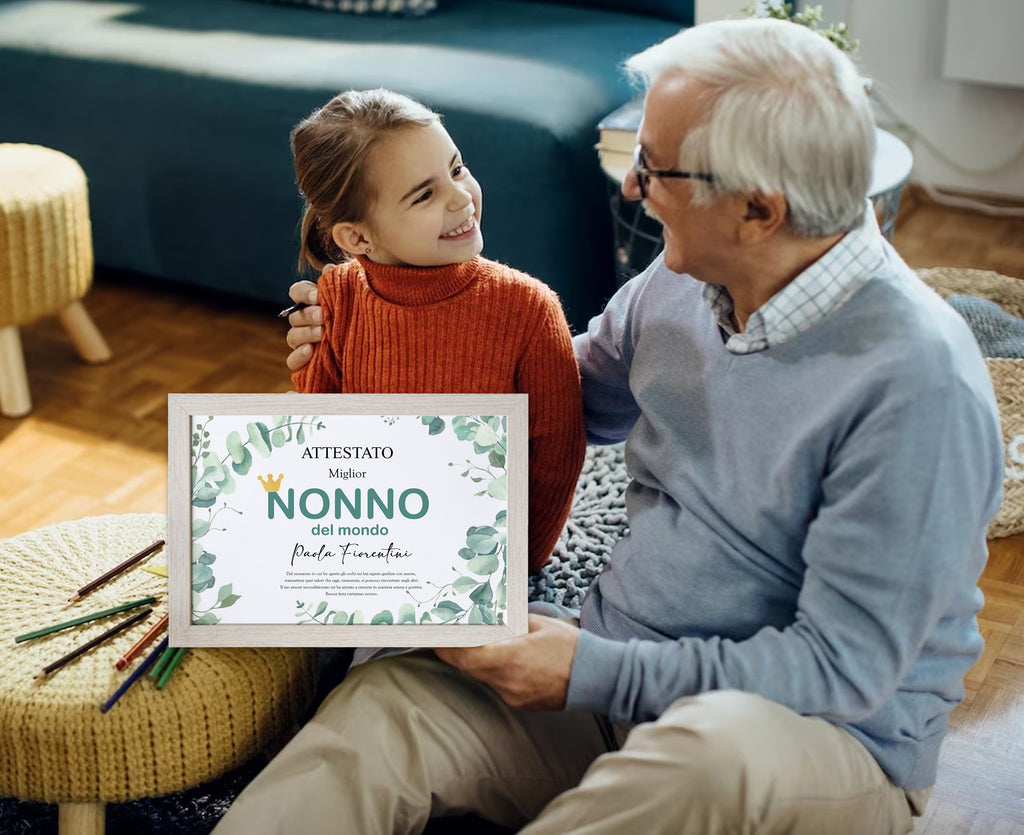 Se stai cercando un regalo originale per i tuoi Nonni in occasione della loro festa o per ogni altra occasione tu voglia stupirli con un regalo personalizzato? Questo attestato gli dimostrerà effettivamente quanto per te loro siano i migliori Nonni del mondo! La cornice è in legno color naturale e misura cm 33x23; l'attestato è in carta 350 gr e misura cm 30x20.