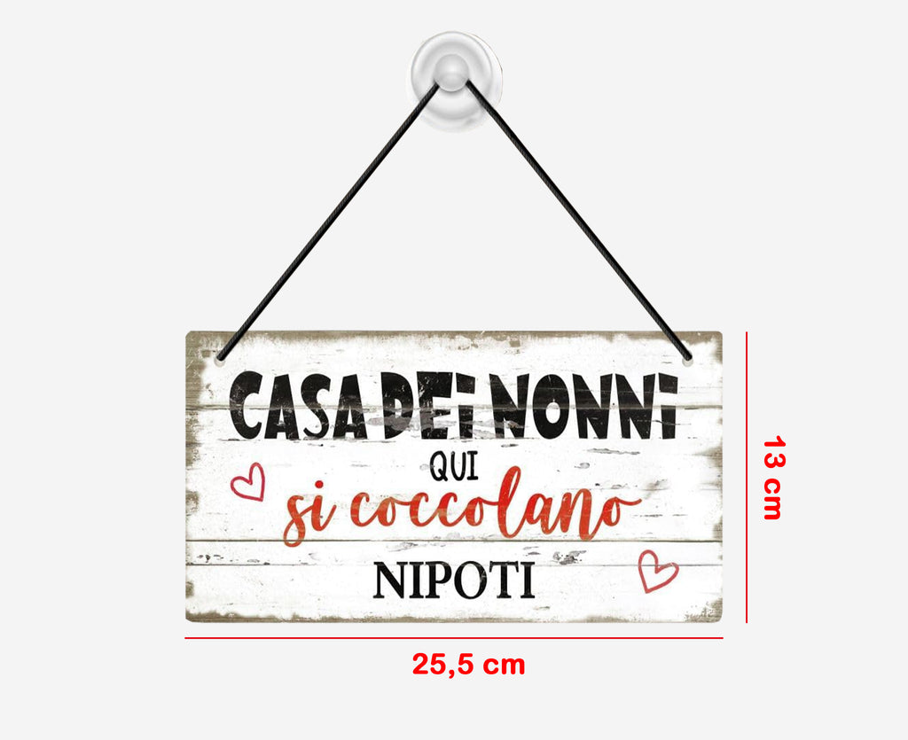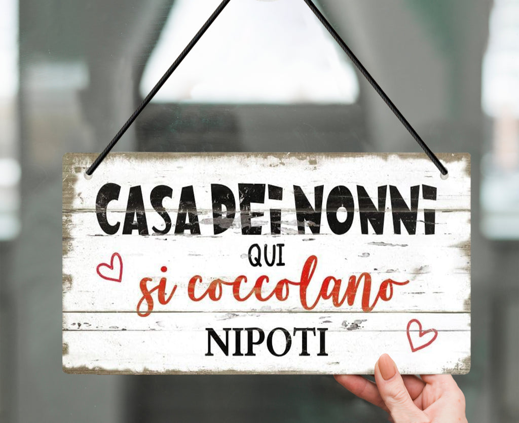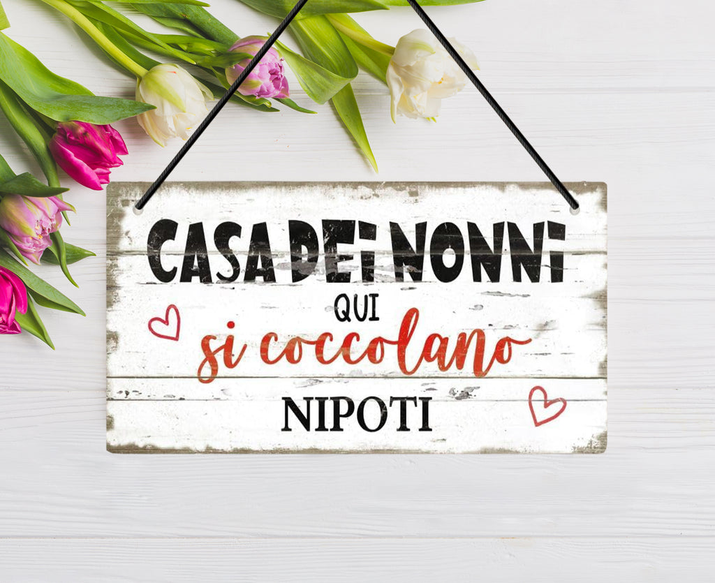 Un dolce pensiero per chi ha sempre le braccia pronte per un abbraccio! Regala ai tuoi genitori (o suoceri) , ai nonni dei tuoi figli, un tocco di amore da appendere alla porta o in casa. Questa targhetta in stile shabby con la scritta “Casa dei nonni – Qui si coccolano i nipoti” è l’idea perfetta per dire “vi vogliamo bene” in modo originale. Completa di cordino per appenderla. Cuoricini decorativi inclusi ❤️
