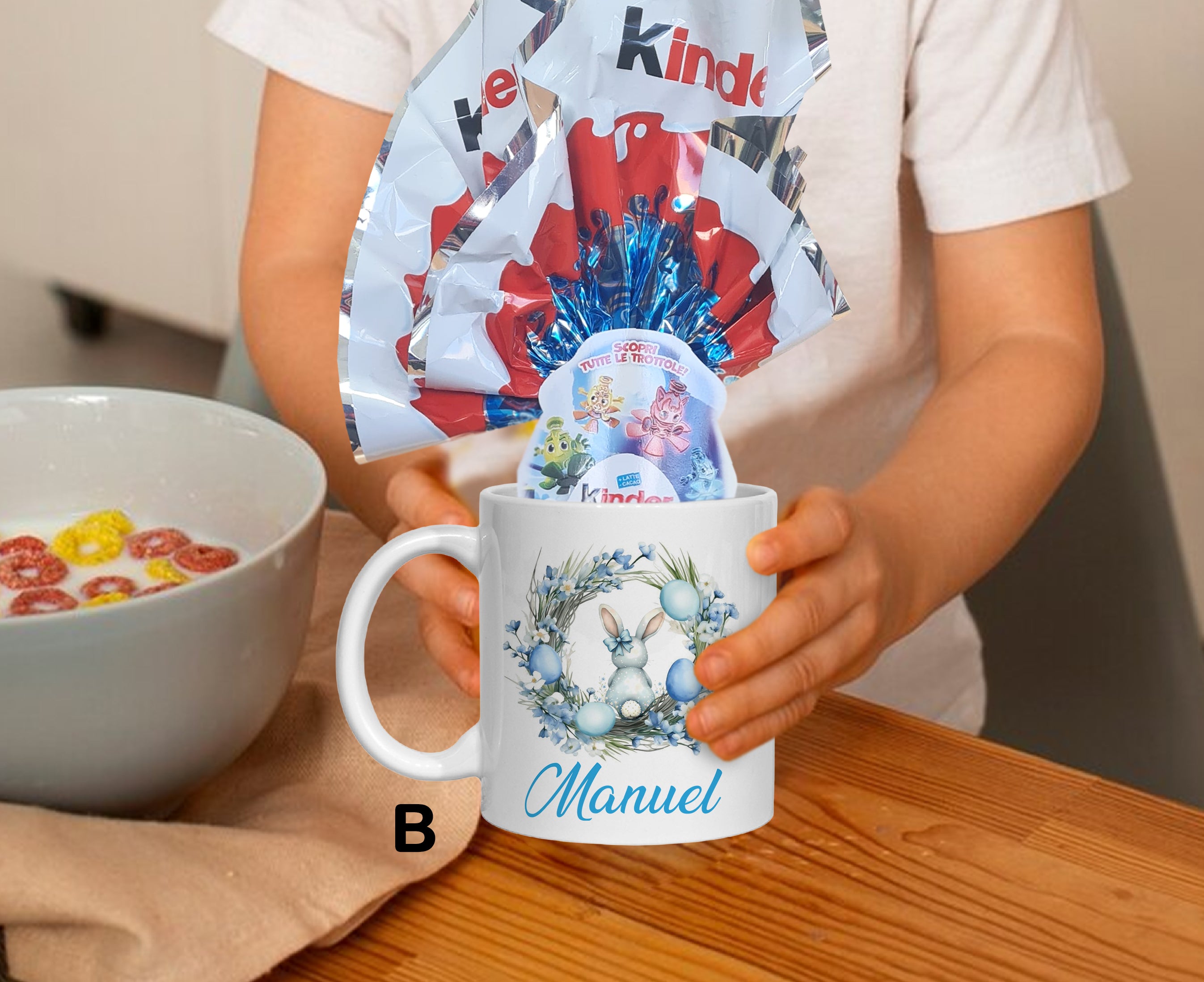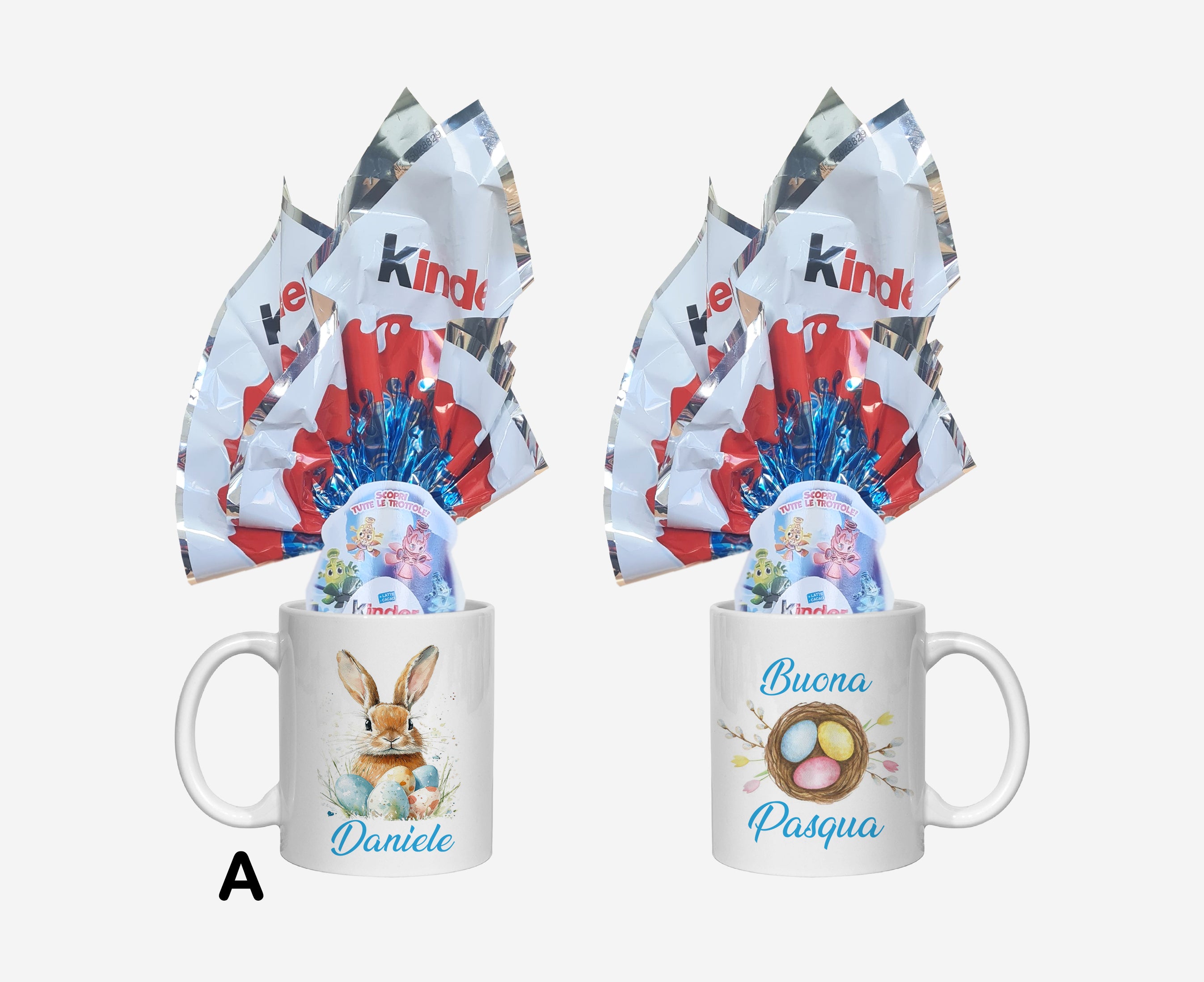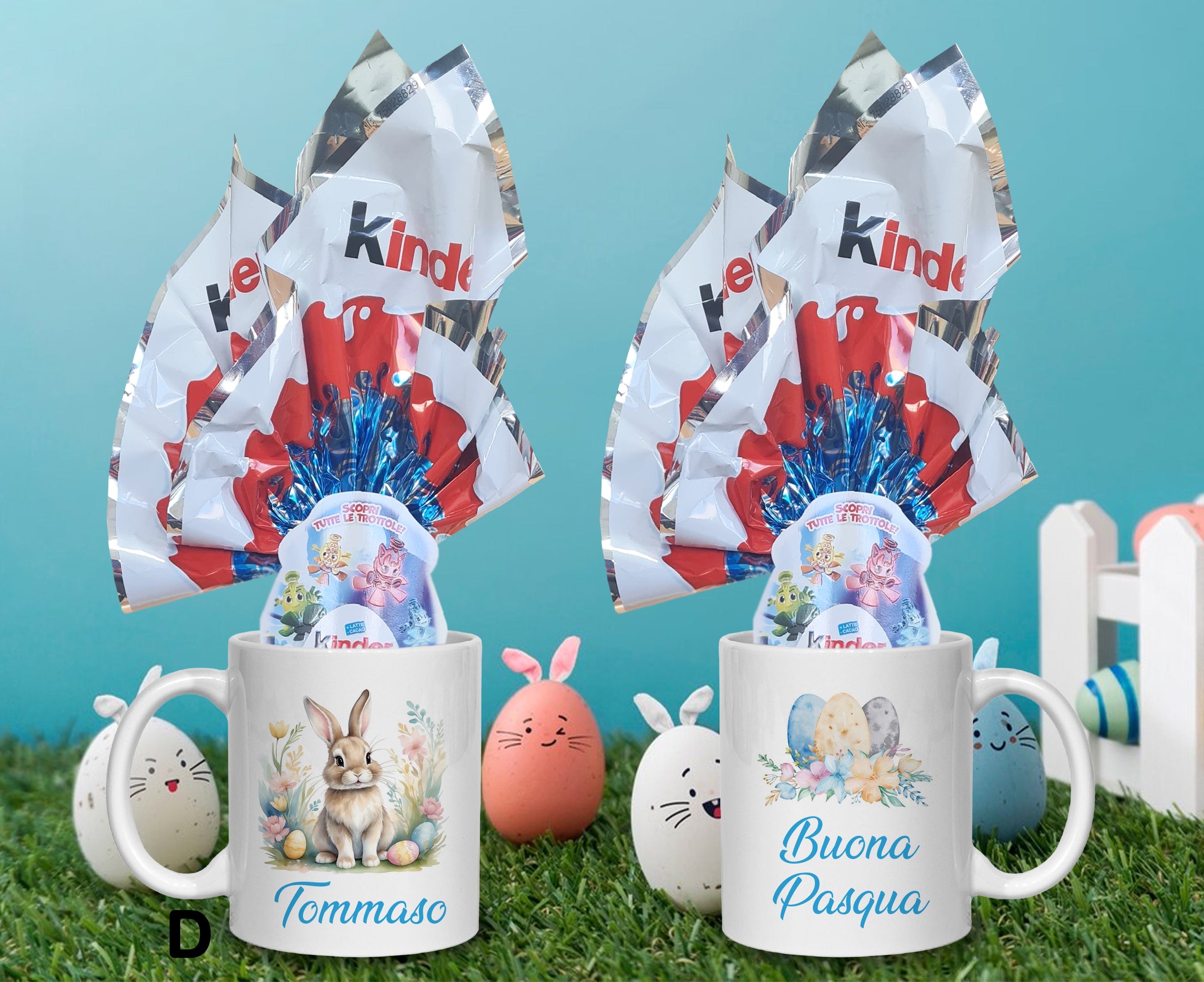 Tazza Mug decorazione pasquale, ideale da regalare a Pasqua , completa di uovo Kinder da 41 grLa tazza con le sue stampe è lavabile in lavastoviglie.