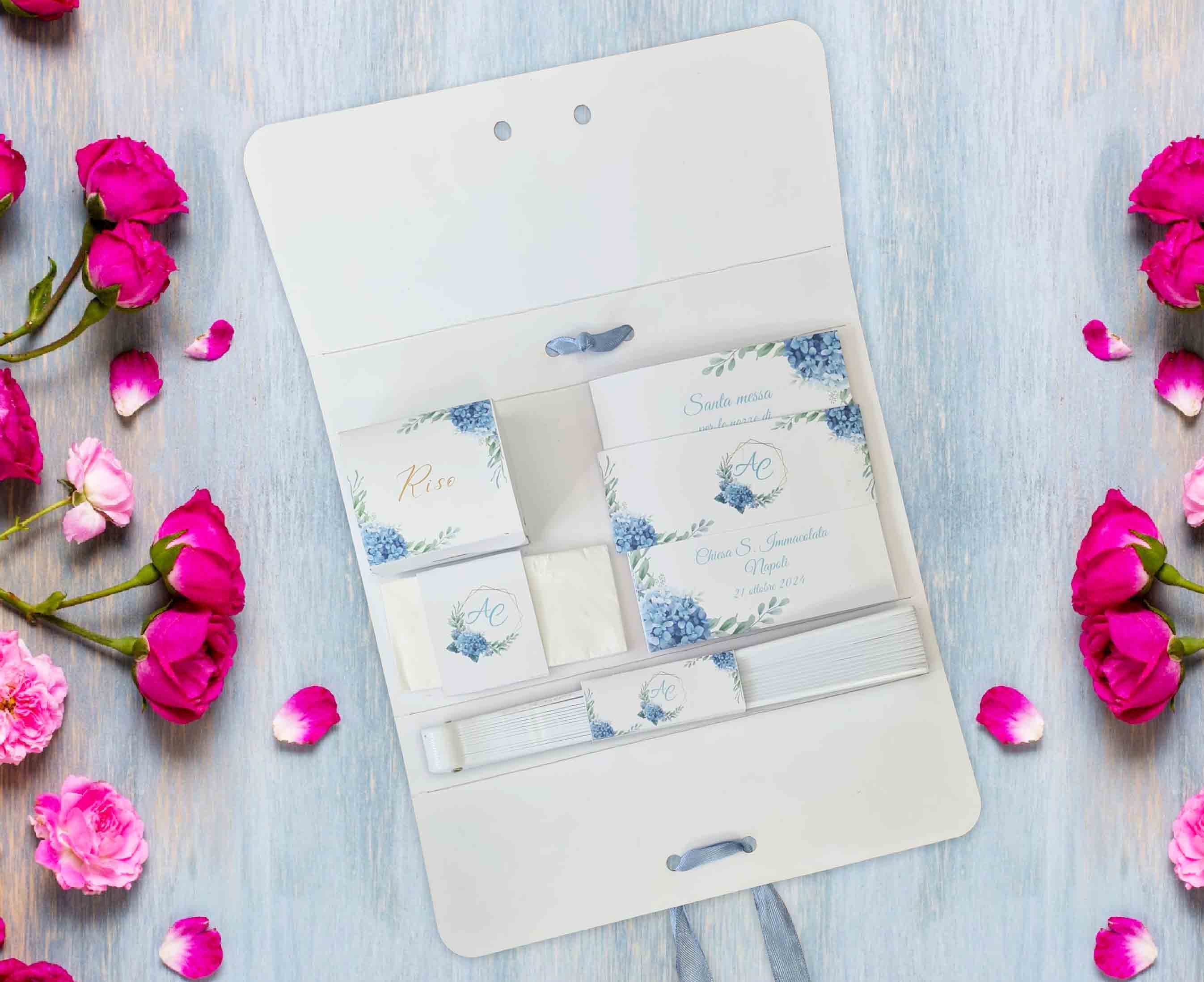 Wedding bag personalizzata per rendere il tuo evento indimenticabile con un tocco di raffinatezza ed originalità. Realizzata in cartoncino bianco 350 gr e nastro in doppio raso 15 mm di colore coordinato alla grafica. La nostra wedding bag è composta da: – scatolina porta riso in bustina trasparente – libretto messa – fazzoletto per lacrime di gioia con tag personalizzato – ventaglio in plastica e tessuto bianco con tag personalizzato Nel prezzo, oltre agli accessori su elencati, è incluso anche il lavoro grafico e la lavorazione. La wedding bag viene consegnata pronta all’uso. Misure: – wedding bag chiusa: 26x13x3 cm – scatolina porta riso 7x6x2,5 cm – libretto messa 12×13 cm, 20 pagine circa – tag lacrime di gioia 5×6 cm – tag ventaglio 7×3 cm E’ possibile realizzare la propria wedding bag in base al tema e al colore del proprio matrimonio. Al momento dell’acquisto, nello spazio riservato alla personalizzazione indicare i dati da stampare. Si prega di contattare il nostro Servizio Clienti per qualsiasi domanda. Ordine minimo 6 pz.