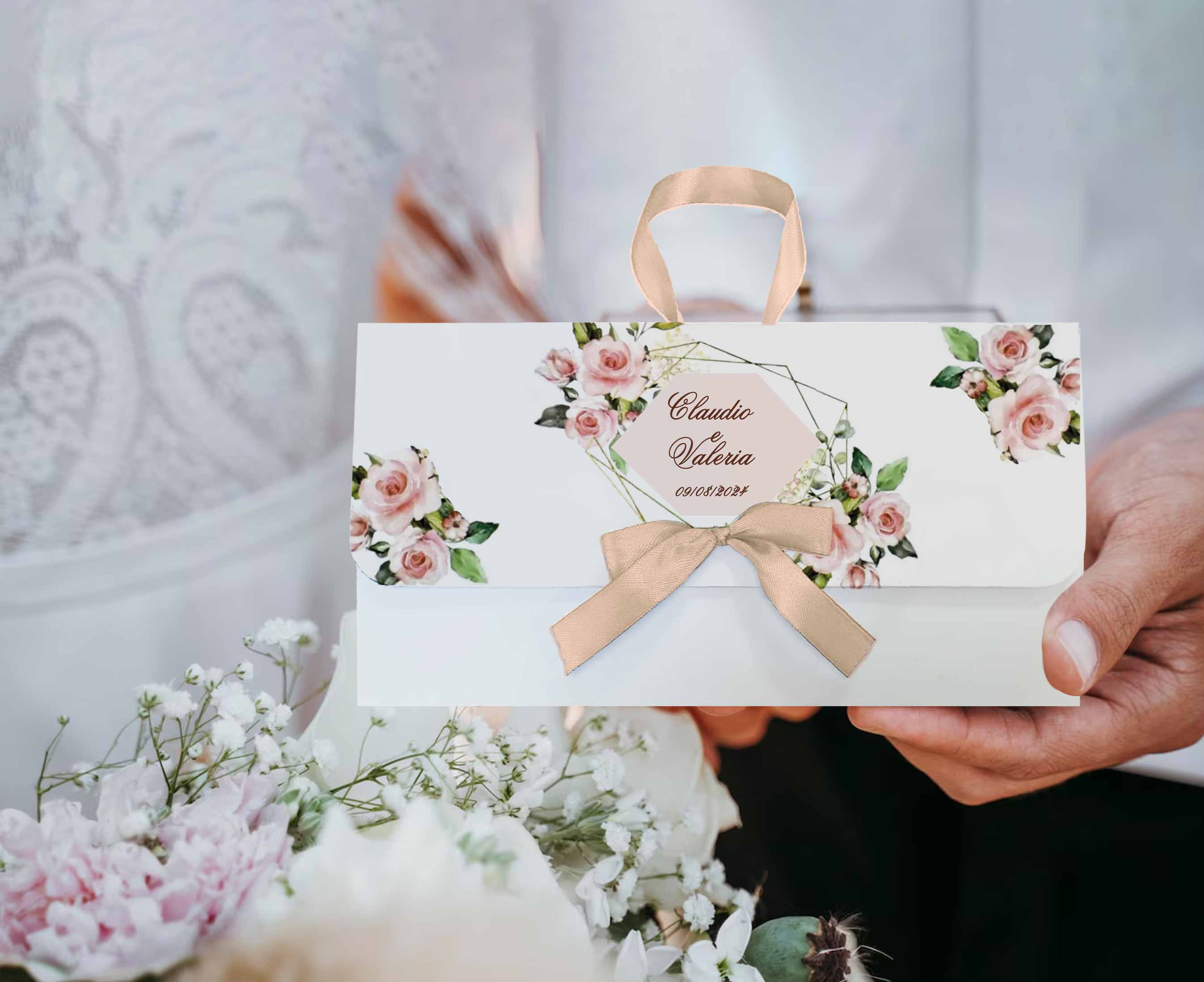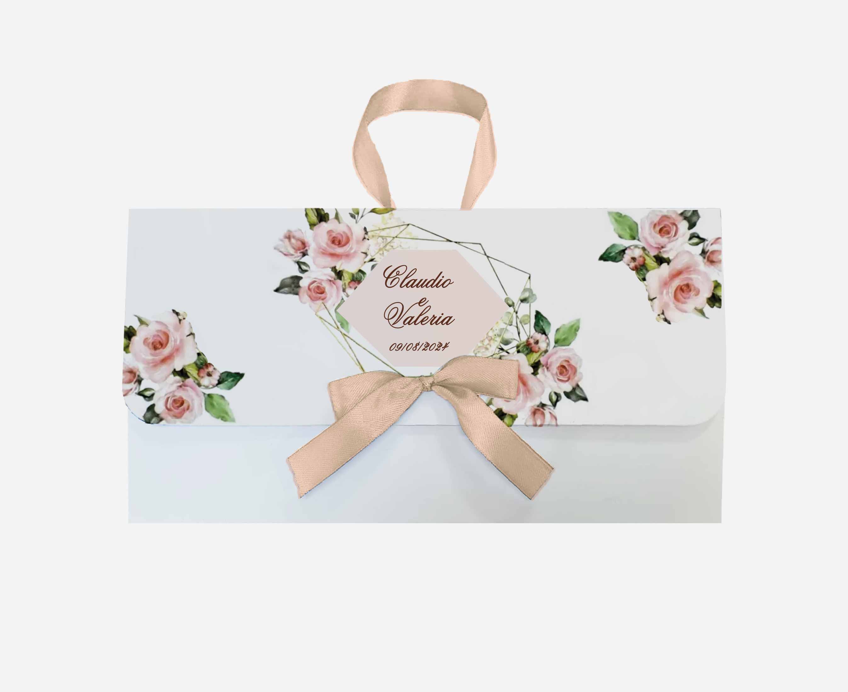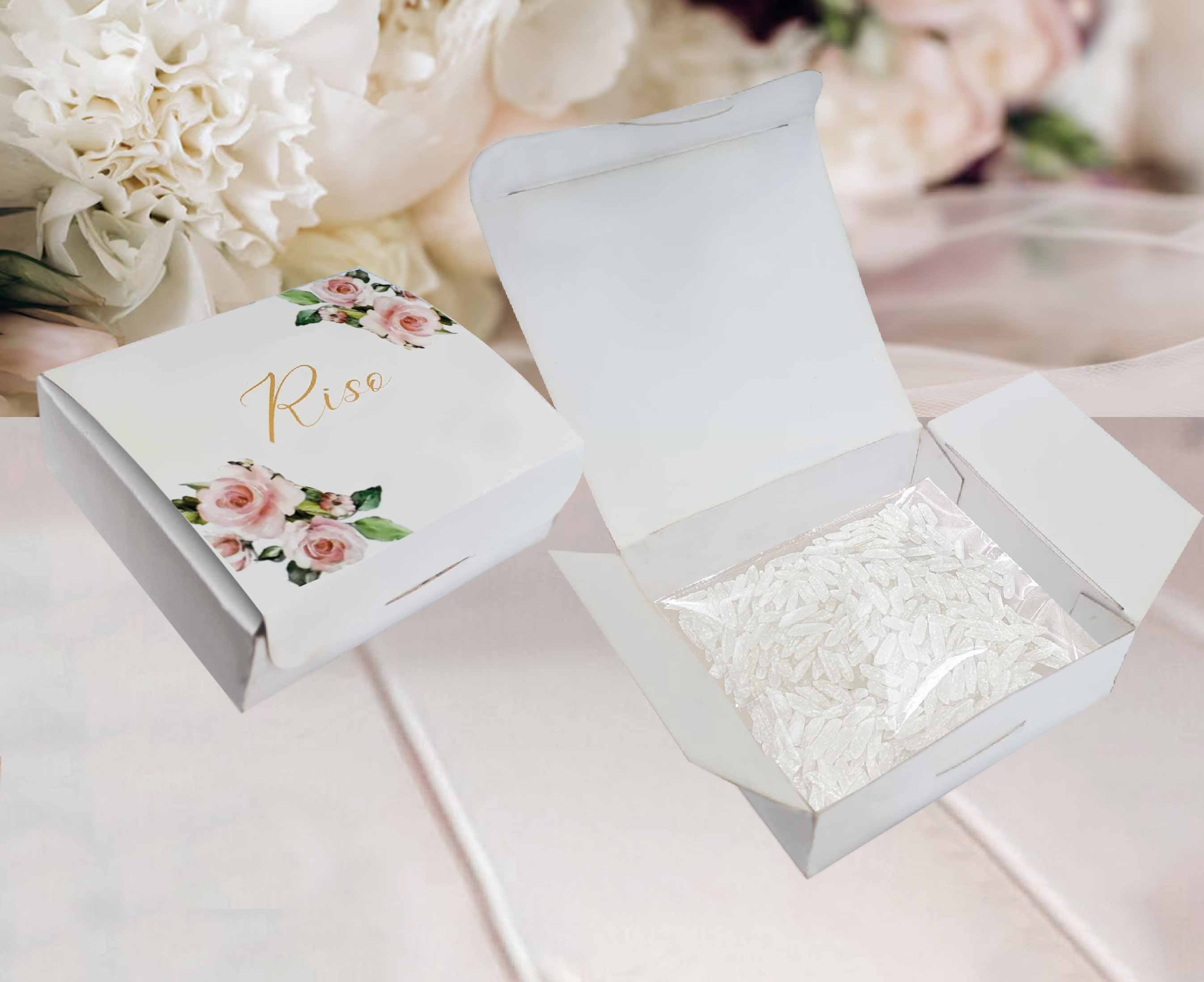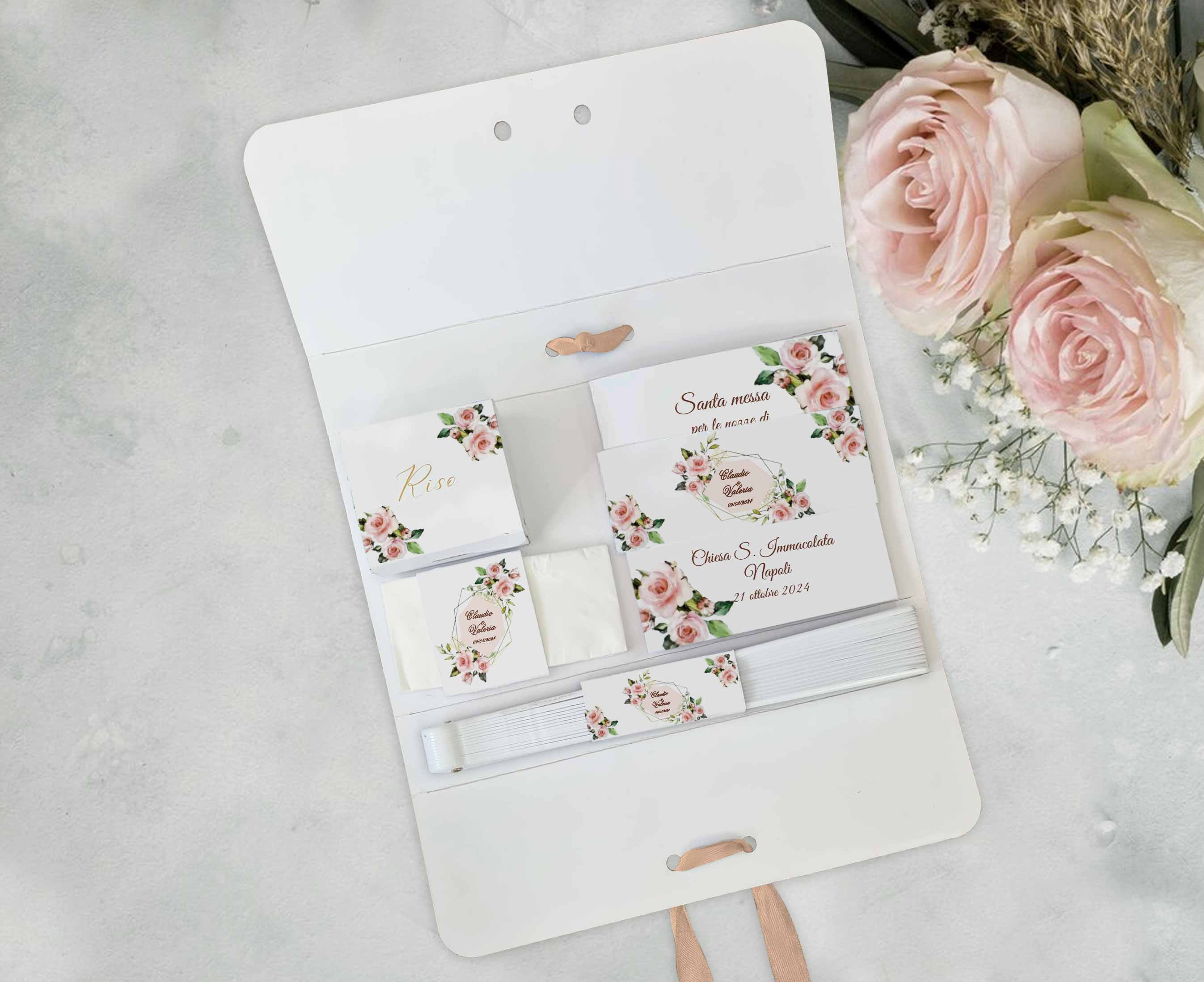 Wedding bag personalizzata per rendere il tuo evento indimenticabile con un tocco di raffinatezza ed originalità. Realizzata in cartoncino bianco 350 gr e nastro in doppio raso 15 mm di colore coordinato alla grafica. La nostra wedding bag è composta da: – scatolina porta riso in bustina trasparente – libretto messa – fazzoletto per lacrime di gioia con tag personalizzato – ventaglio in plastica e tessuto bianco con tag personalizzato Nel prezzo, oltre agli accessori su elencati, è incluso anche il lavoro grafico e la lavorazione. La wedding bag viene consegnata pronta all’uso. Misure: – wedding bag chiusa: 26x13x3 cm – scatolina porta riso 7x6x2,5 cm – libretto messa 12×13 cm, 20 pagine circa – tag lacrime di gioia 5×6 cm – tag ventaglio 7×3 cm E’ possibile realizzare la propria wedding bag in base al tema e al colore del proprio matrimonio. Al momento dell’acquisto, nello spazio riservato alla personalizzazione indicare i dati da stampare. Si prega di contattare il nostro Servizio Clienti per qualsiasi domanda. Ordine minimo 6 pz.